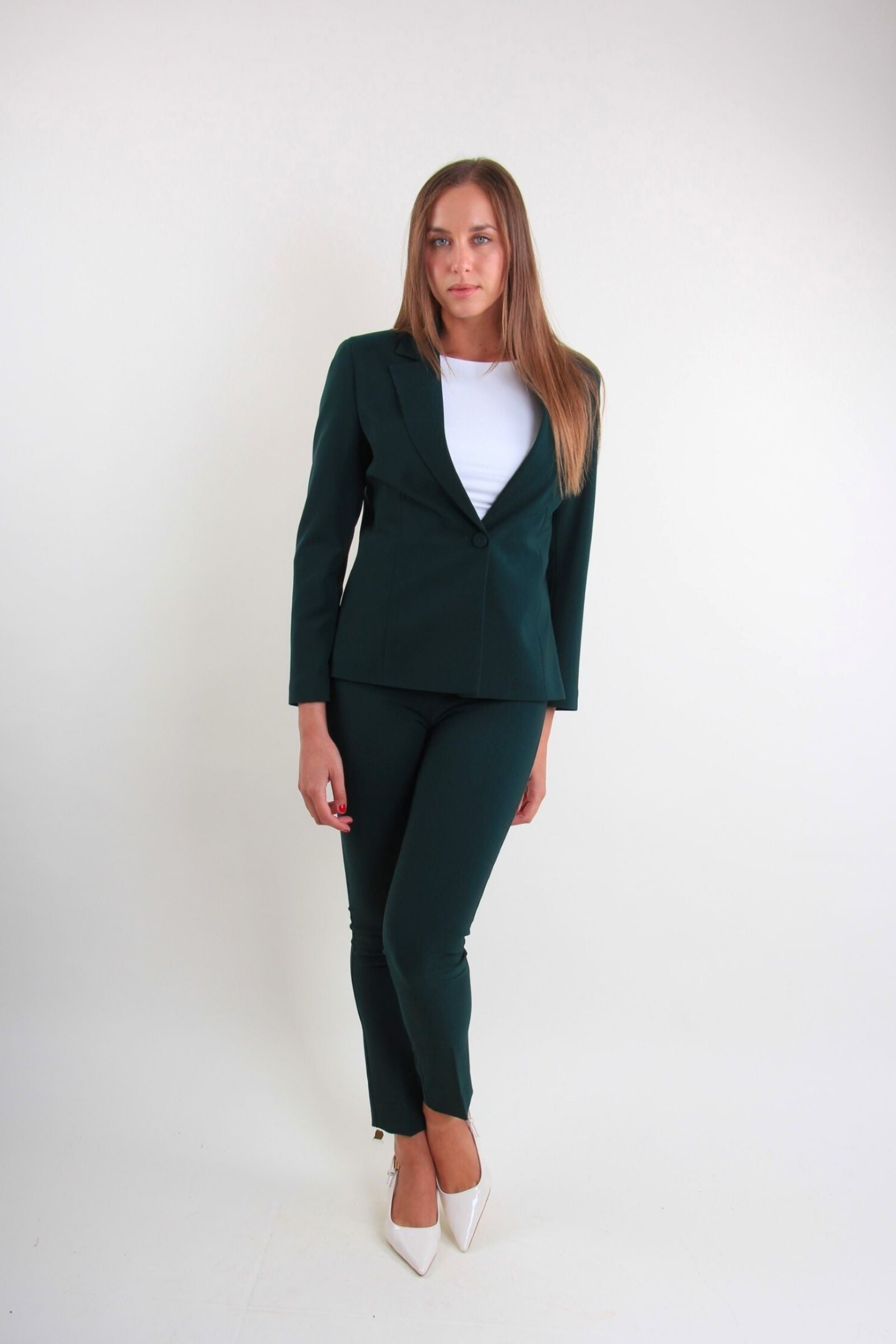 Completo donna blazer e pantalone slim a sigaretta, elegante e versatile. Il taglio sartoriale valorizza la silhouette, mentre il tessuto confortevole assicura libertà di movimento e portabilità quotidiana. Indossato in coordinato trasmette uno stile sofisticato e professionale, ideale per l’ufficio, eventi e occasioni speciali.